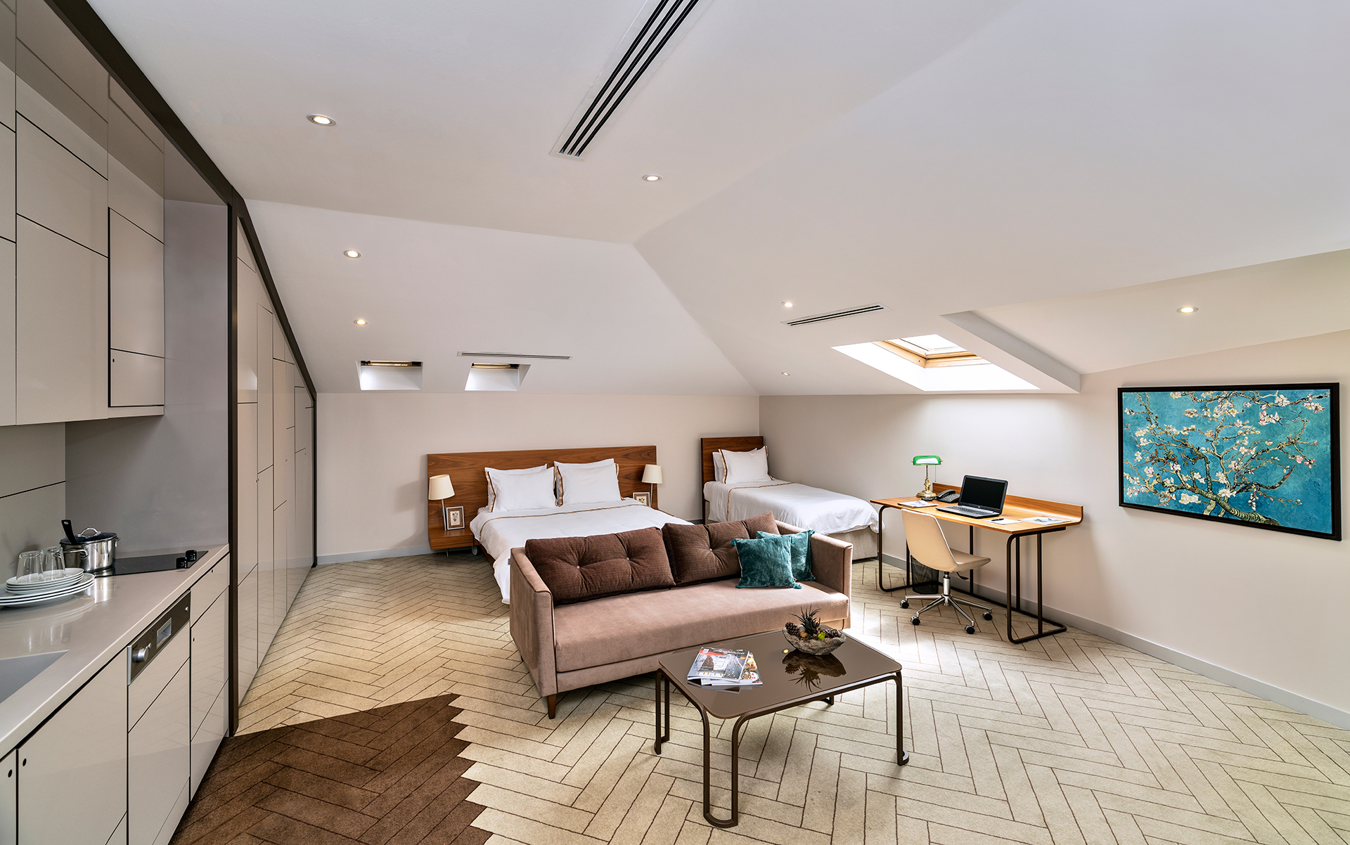 Modern ve minimal fikirlerle tasarlanmış ev konforu sunan 35 m2’lik ferah Superior Süitlerimizde; 42”LED TV ve satellite (tüm uydu kanalları), bulaşık makinesi, mikrodalga fırın, ocak, elektrikli su ısıtıcısı, buzdolabı, yemek masası bulunan donanımlı bir mutfak, iki kişilik koltuğun bulunduğu oturma bölümü, çalışma masası, telefon, laptop boyutunda şarjlı safebox, ütü ve ütü masası, kablolu/kablosuz internet bağlantısı, ücretsiz çay ve kahve setup, 1 çift kişilik yatak ve 1 tek kişilik kanepe, merkezi ısıtma/soğutma sistemi ve banyo bulunmaktadır.