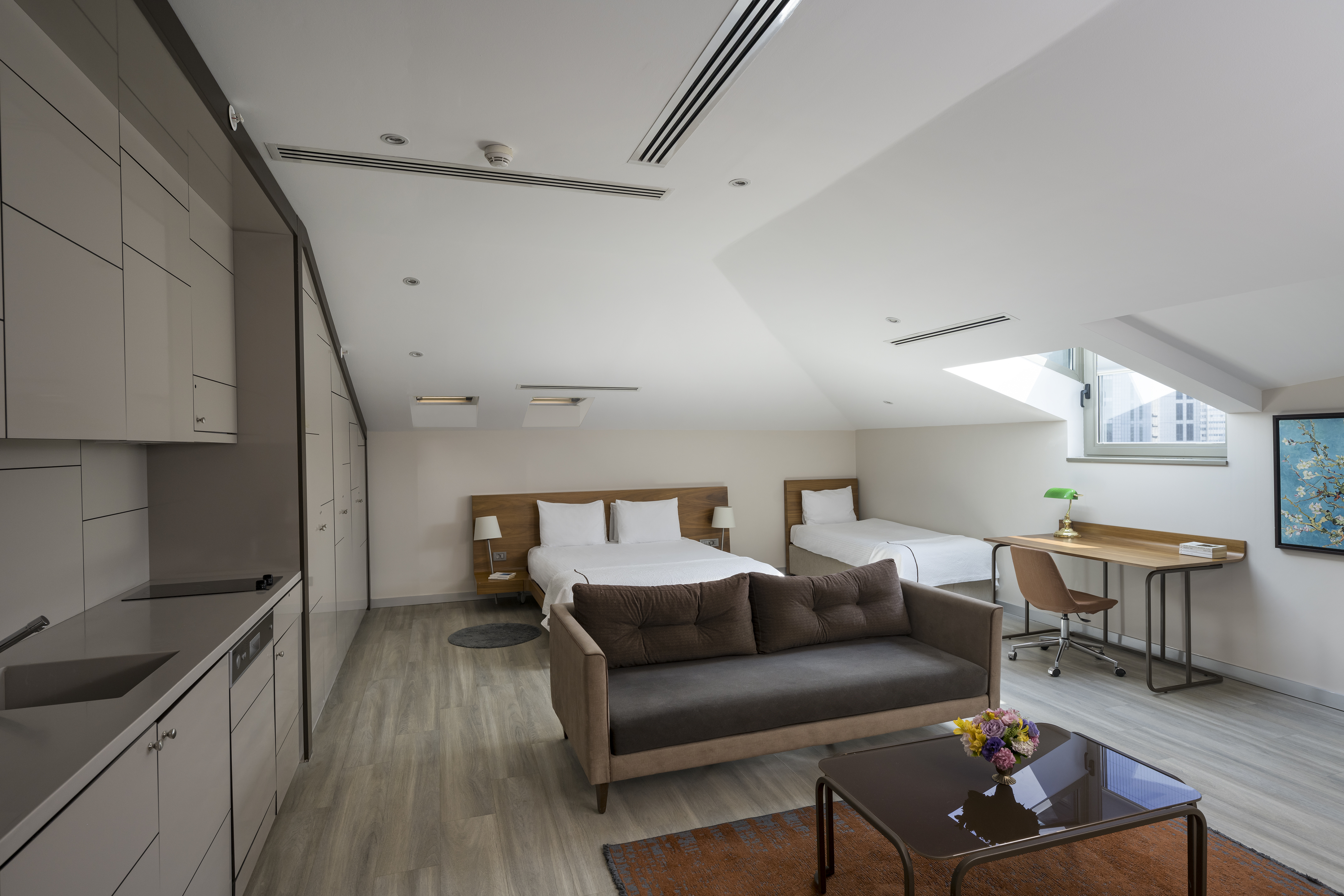 Şehri tepeden deneyimleyerek, eviniz kadar geniş, ferah bir alanda daha özgür konaklama keyfi sunan 40/45 m2’lik çatı stüdyolarımızda 42”LED TV ve satellite (tüm uydu kanalları), bulaşık makinesi, mikrodalga fırın, ocak, elektrikli su ısıtıcısı, buzdolabı, yemek masası bulunan donanımlı bir ...